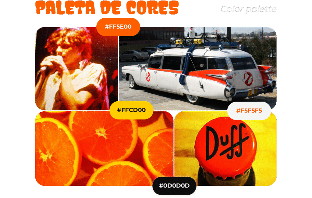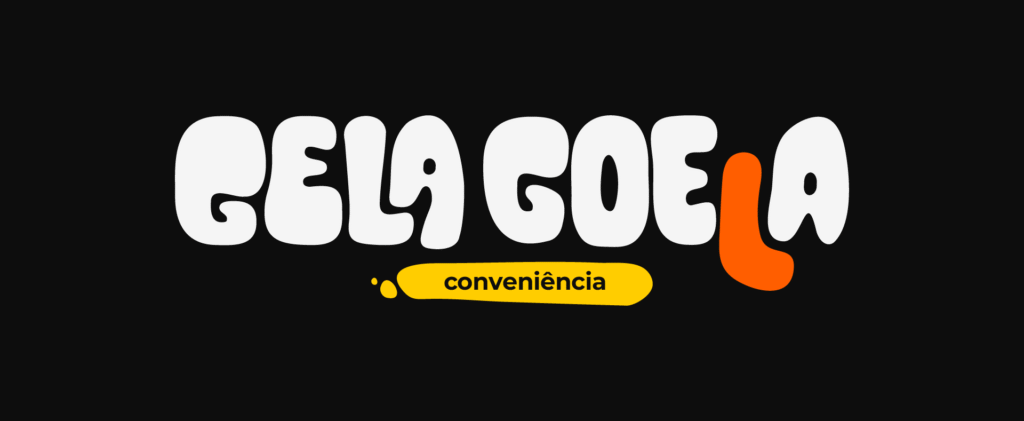 A paleta de cores da Gela Goela traduz a personalidade ousada e divertida da marca, com tons vibrantes que remetem diretamente à estética psicodélica dos anos 80. O laranja e o amarelo trazem energia, frescor e uma sensação de calor que combina perfeitamente com o universo das bebidas e do entretenimento. O branco rosado entra como respiro visual, equilibrando a composição e trazendo leveza, enquanto o preto acinzentado reforça o contraste, garantindo impacto e legibilidade. Juntas, essas cores criam uma identidade marcante, que chama atenção de longe e permanece na memória — assim como os bons momentos que a Gela Goela quer proporcionar.