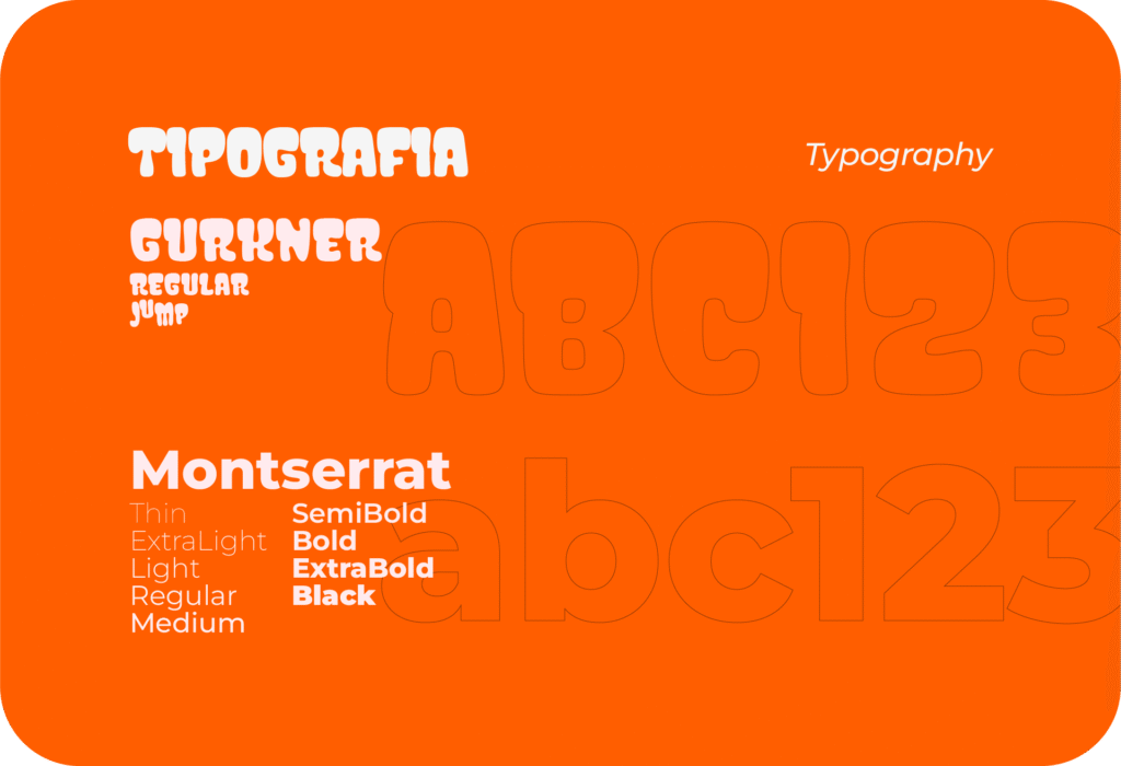 A fonte Gurkner, com formas arredondadas, groovy e cheias de atitude, resgata a estética psicodélica dos anos 80, adicionando energia e originalidade às aplicações da marca. Já a Montserrat entra como fonte de apoio, oferecendo legibilidade e versatilidade em diferentes pesos — perfeita para conteúdos informativos, embalagens e comunicação digital. Juntas, essas tipografias criam um contraste visual marcante, equilibrando o tom descontraído com clareza e funcionalidade.